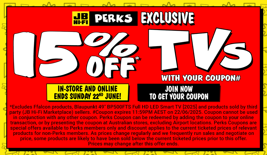 *Excludes Ffalcon products, Blaupunkt 49" BP500FTS Full HD LED Smart TV [2025] and products sold by third party (JB Hi-Fi Marketplace) sellers. #Coupon expires 11:59PM AEST on 22/06/2025. Coupon cannot be used cannot in conjunction with any other coupon. Perks Coupon can be redeemed by adding the coupon to your online transaction, or by presenting the coupon at Australian stores, excluding Airport locations. Perks Coupons are special offers available to Perks members only and discount applies to the current ticketed prices of relevant to products for non-Perks members. As prices change regularly and we frequently run sales and negotiate on price, some products are likely to have been sold below the current ticketed prices prior to this offer. Prices may change after this offer ends.